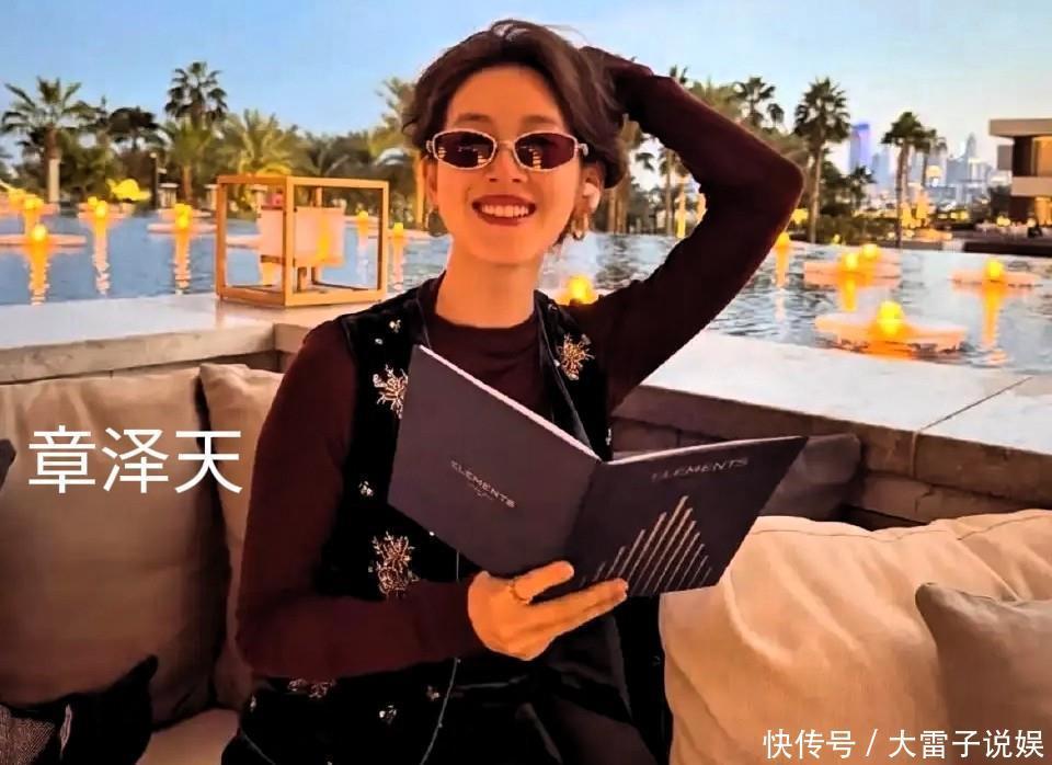 照片中章泽天戴着墨镜身处海边高级度假酒店,妆容精致,一身简约装扮,笑容很甜美。
